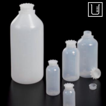 Botellas fabricadas en polietileno natural translúcido, pensadas para el almacenamiento de ácidos y bases.