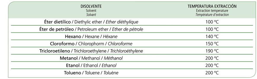 El sistema Soxtest extrae la grasa y otras materias solubles en alimentos, piensos, suelos, detergentes, polímero, pulpa de papel, fibras, gomas, textiles, productos farmacéuticos y petroquímicos.