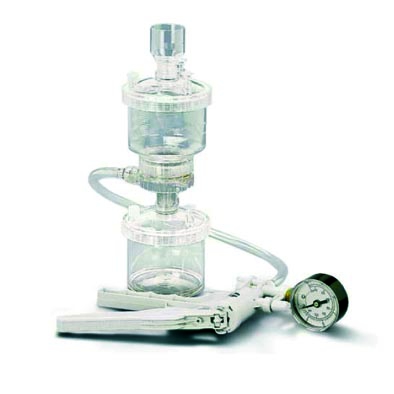 Puede funcionar con vacio o con ligera presión (máximo 0.5 bar). En combinación con una bomba de vacio manual es un equipo ideal para la filtración de muestras fuera del laboratorio.