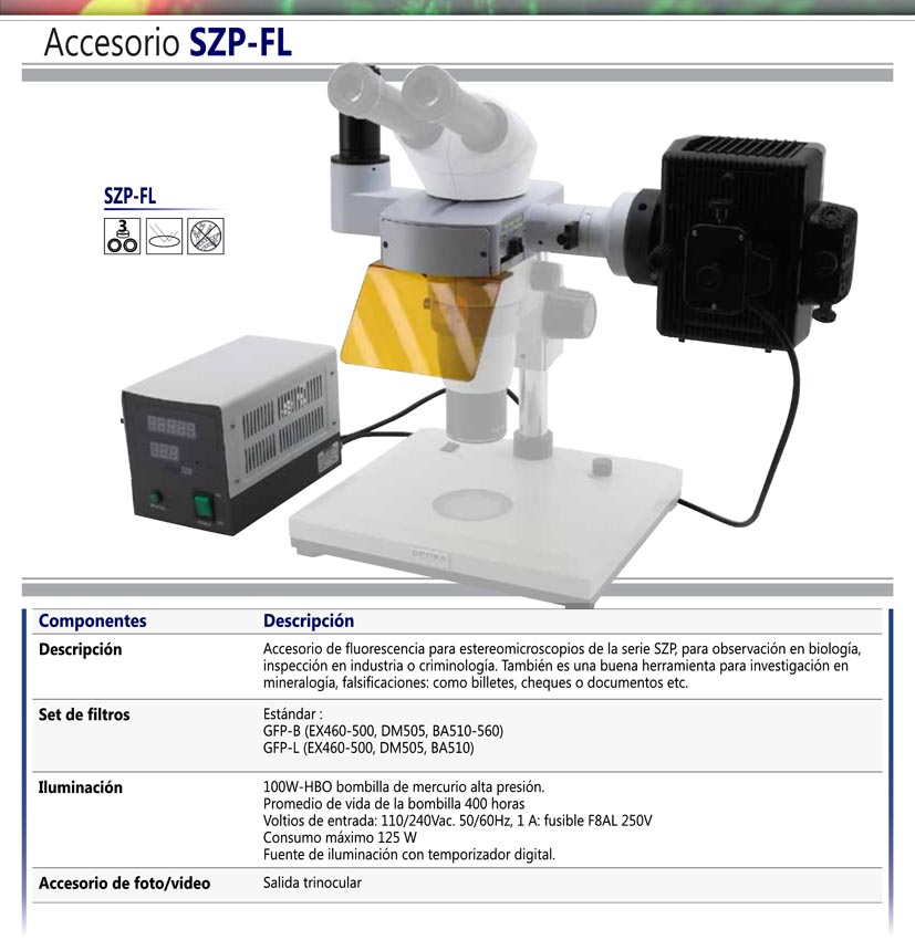 Accesorio de fluorescencia para estereomicroscopios de la serie SZP, para observación en biología, inspección en industria o criminología.